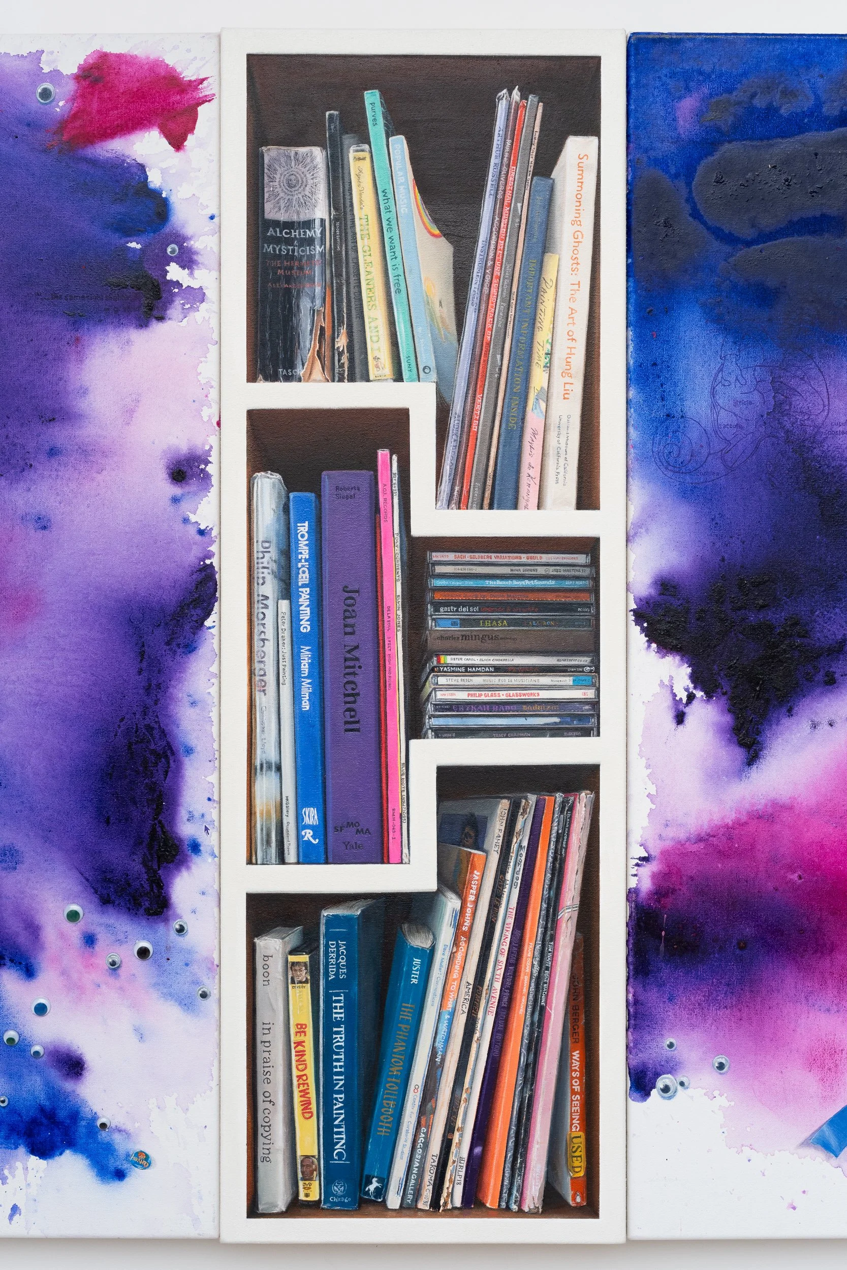 Oil on linen with hand carved shelf, books, brass figurine, and hand painted QR code linked video